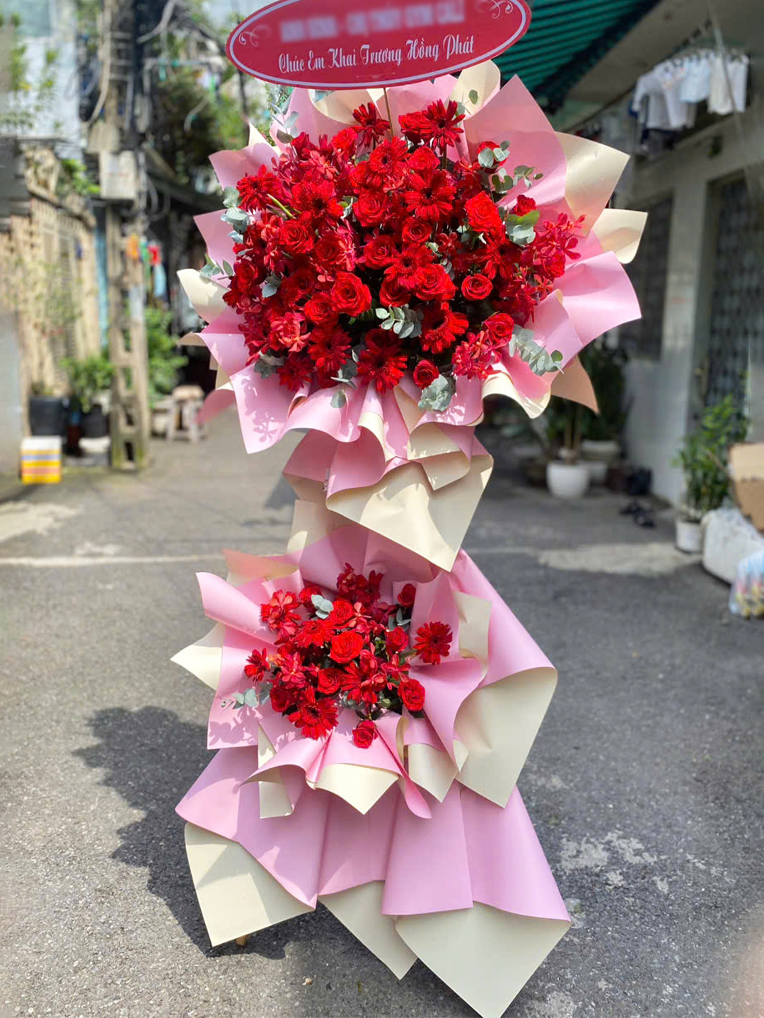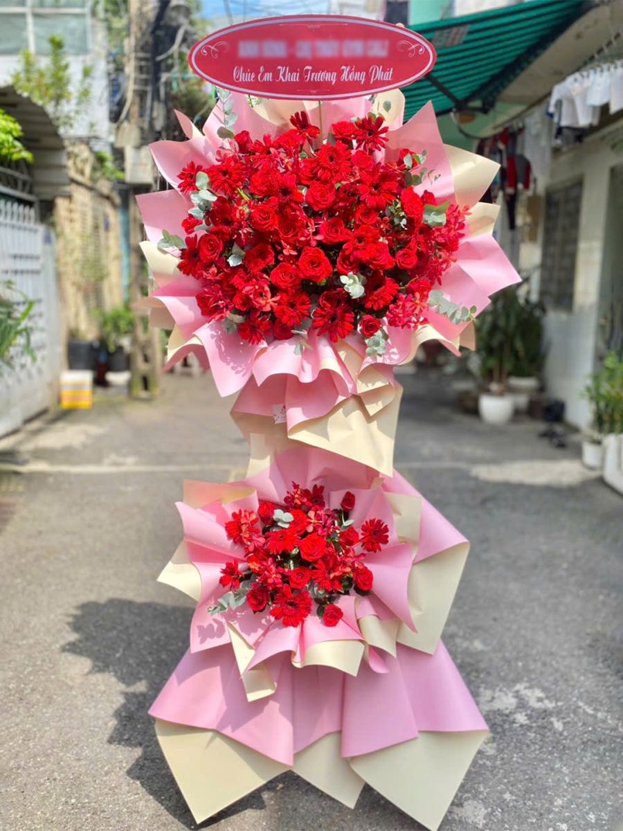 Kệ Hoa Khai Trương lấy tông chủ đạo là màu đỏ để tôn lên sự nổi bật tươi vui, như một lời khen ngợi cho thành tích vượt bậc và sự nỗ lực để có được ngày vui hôm nay. Đây là món quà ý nghĩa dành tặng cho đồng nghiệp, đối tác.