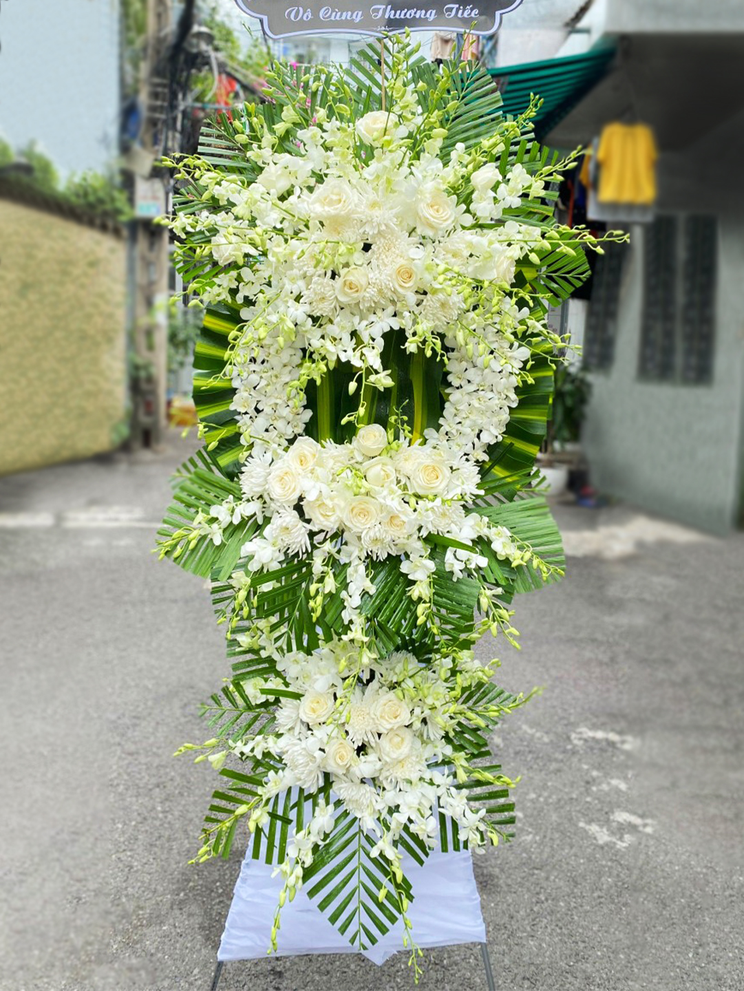 Những bông hoa đẹp nhất được kết thành Lẵng Hoa Viếng Đẹp trắng thuần khiết thường được sử dụng trong những buổi tang lễ trang nghiêm.
